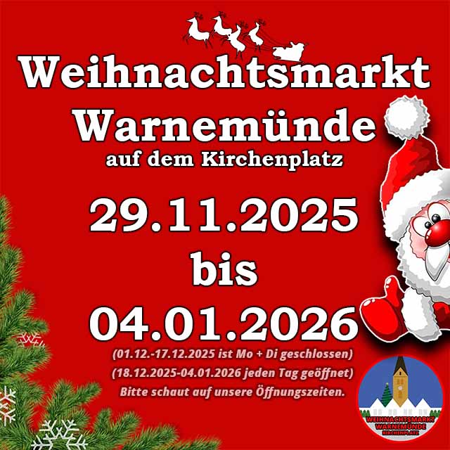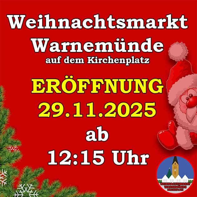 Bald ist es soweit – der Warnemünder Weihnachtsmarkt öffnet seine Tore! Vom 29. November 2025 bis zum 4. Januar 2026 verwandelt sich der Kirchenplatz wieder in ein kleines Winterwunderland voller Lichter, Düfte und gemütlicher Momente. 🎅🎁