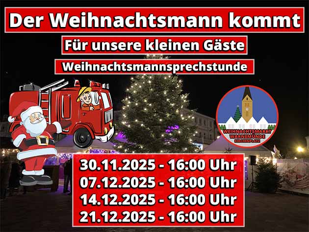 Für unsere kleinen Gäste öffnet der Weihnachtsmann an ausgewählten Adventssonntagen seine ganz persönliche Sprechstunde auf dem Warnemünder Weihnachtsmarkt. 🌟